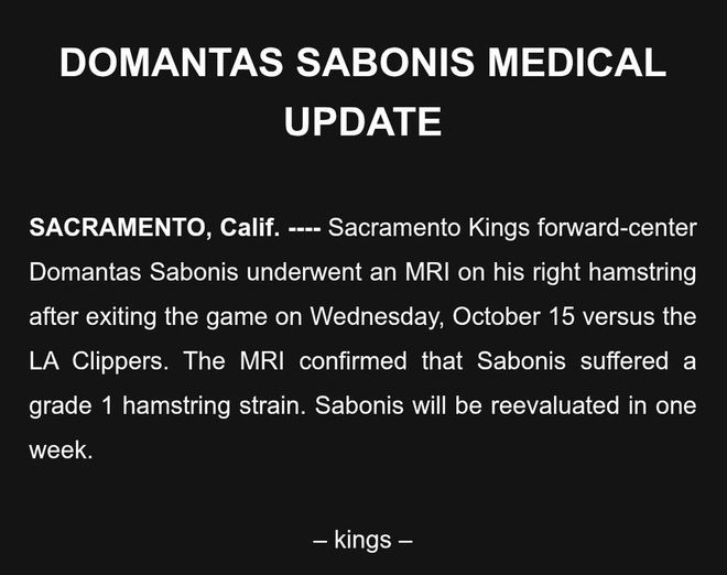萨博尼斯在季前赛输给快船的比赛中因腿筋问题离场,随后在周五晚上洛杉矶的季前赛收官战中,他因接受检查而缺席。这被认为是一次轻微的拉伤,但萨博尼斯将无法在国王队对阵太阳队的赛季揭幕战,以及对阵爵士队的主场揭幕战中出场。他最早可能在10月27日对阵湖人队的比赛中回归。