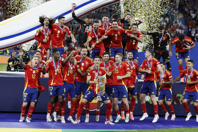2024年7月14日,欧洲杯决赛,西班牙凭借奥亚萨瓦尔的进球2-1绝杀英格兰,以7战全胜的战绩,第四次赢得欧洲杯冠军。队长莫拉塔高举德劳内杯,德拉富恩特带队梦回博斯克时代。